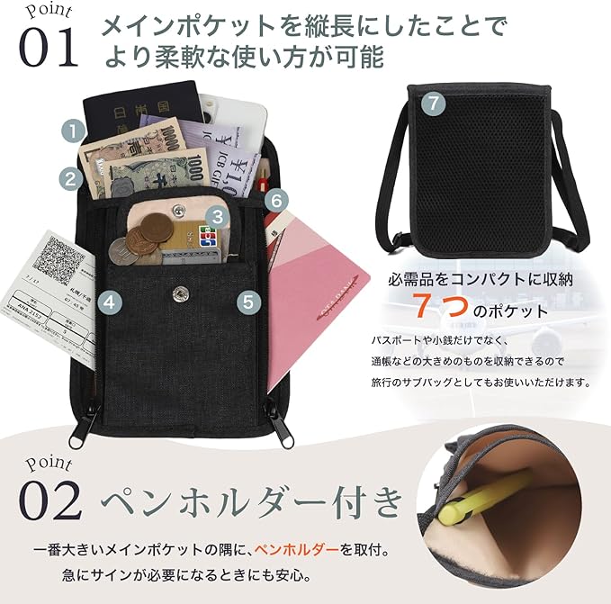 コンパクトながら便利なポケットが充実しています。現金、カード、、スマホなどパスポートだけでなく様々な小物が整理して収納でき、旅行のサブバッグとしても優秀な肩掛けポーチです。