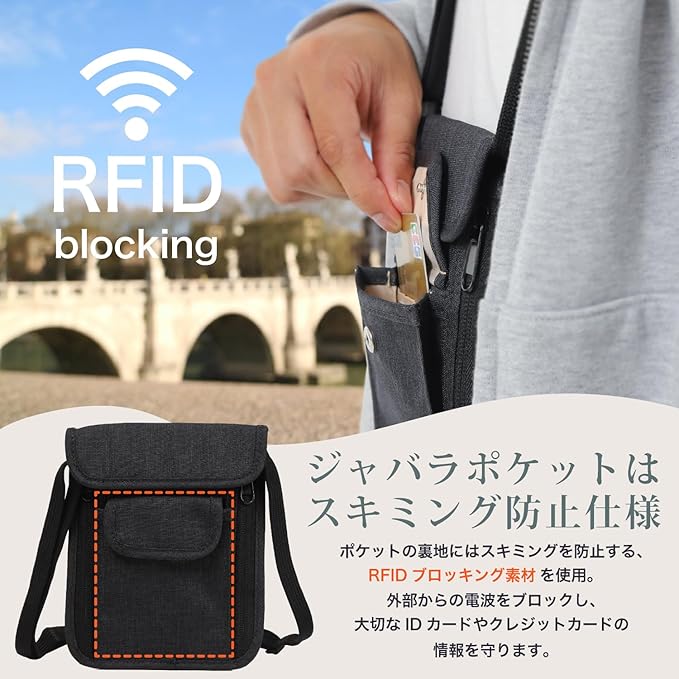 丈夫で薄いトラベルウォレット!現金、パスポート、カードがさっと取り出せてしっかり守れるスキミング防止をしてくれるパスポートケースです。服の中に入れてもかさばらない軽量コンパクトな薄型で首下げタイプ、ショルダー、斜め掛けもでき、海外旅行での盗難防止に役立つセキュリティポーチとして。