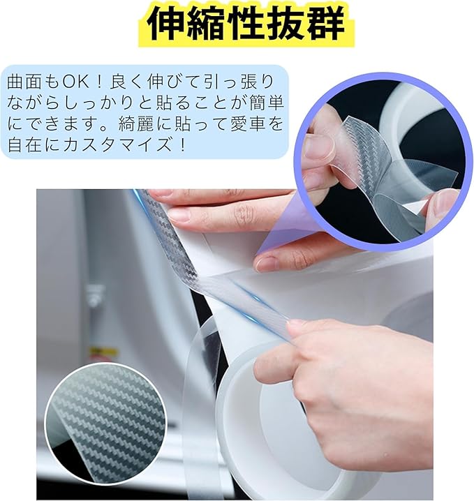 ★【伸縮性抜群】 自由な変形とフリークリッピングが可能で、良く伸びて引っ張りながらしっかりと貼ることが簡単にできます。 サイドシルに曲面がある場合でも対応できます。取付位置のサイズよりも商品のサイズが大きすぎる場合、車に合わせてサイズや形状をカットできます。