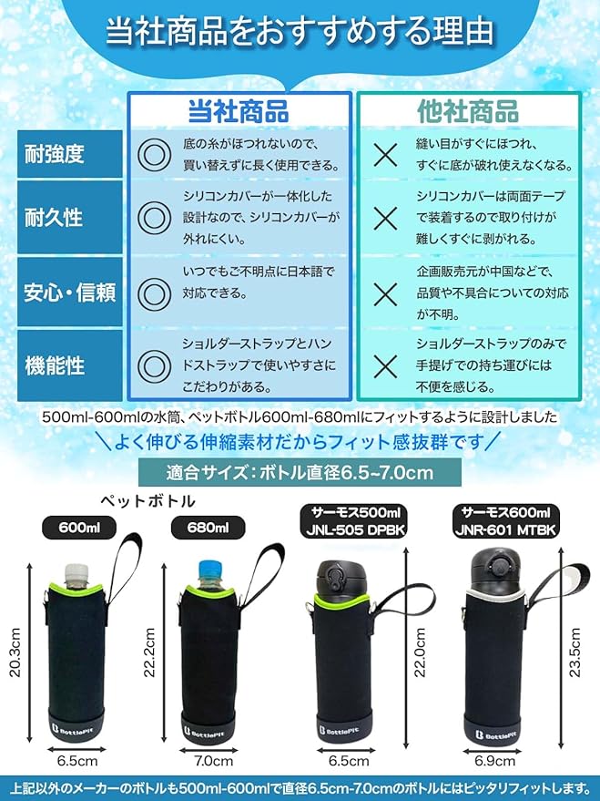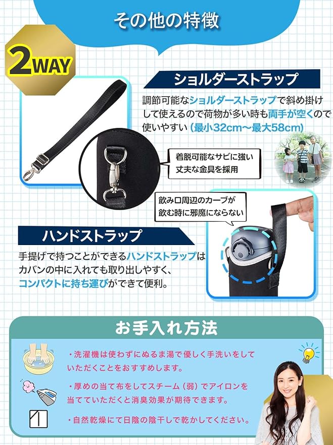 2Way:ハンド&ショルダーストラップ、推奨ボトルサイズ:480mL~500mL、(底部直径が6.5mm前後のストレートタイプにおススメ)