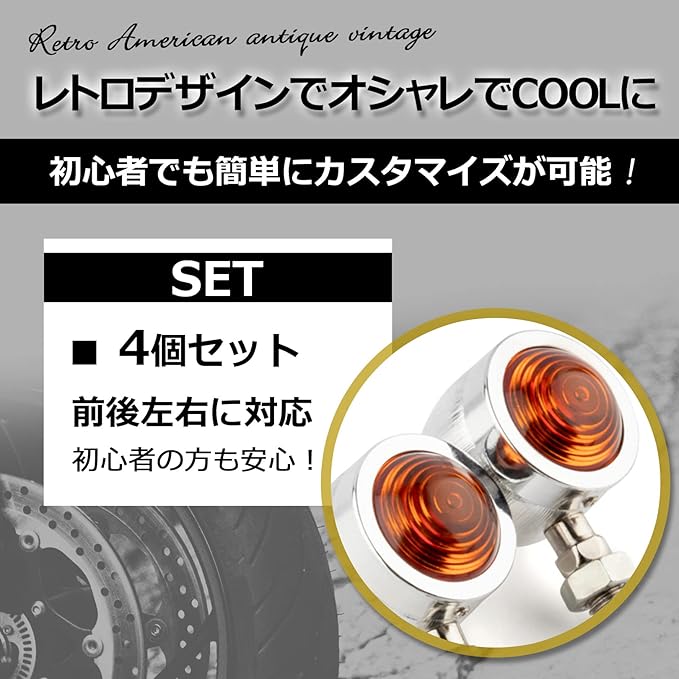 温かみのあるアンバーのライトがレトロアメリカンを思わせるデザイン。自分でカスタムできるので、取り付け位置も自由自在。目立たない場所に設置する、フェンダーに埋め込むなどお好みでアレンジできます。