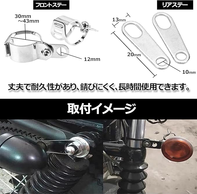 フロント、リアステー各2個セットは、ウィンカー設置用パーツ、取り付け専用ボルト付き、DIY、カスタム、改造が簡単。ウインカーを固定、脱落防止、安定性を高めます。F、Rステーは、ライトのボディーと同色で、高汎用タイプ。