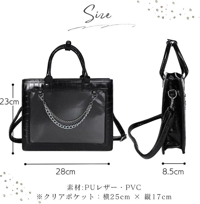 素材:PUレザー・PVC サイズ:横28cm 縦23cm 厚さ8.5cm クリアポケット:横25cm 縦17cm