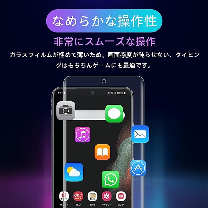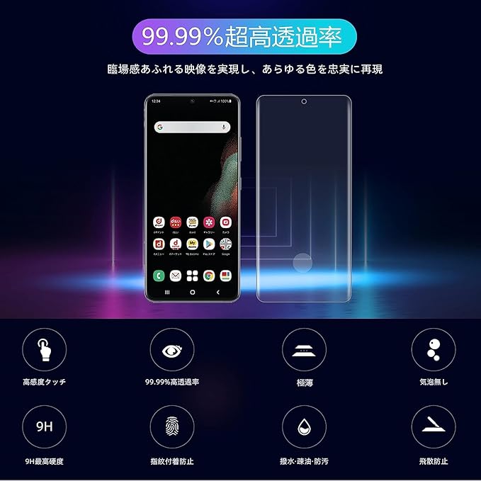 【透明度】:光の高透過率で、画面に最高レベルの保護を施しながら、保護フィルム自体の存在感を感じさせません、上品でエレガントな印象を与えます。【高透過率】:フレームがない全面クリアタイプを採用し、端末のデザインを隠さず、画面を美しく守ります。高画質な写真や動画を楽しむことができます。