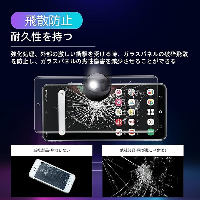 【日本旭硝子素材、9H】日本製最上級旭硝子ガラスを使用し、表面硬度9Hなので、キズが付きにくい保護フィルム。ナイフや鍵などの尖ったものでも簡単には傷がつきません。万が一ガラスフィルムが破損した際にガラス片が飛散しない飛散防止処理も施されています。