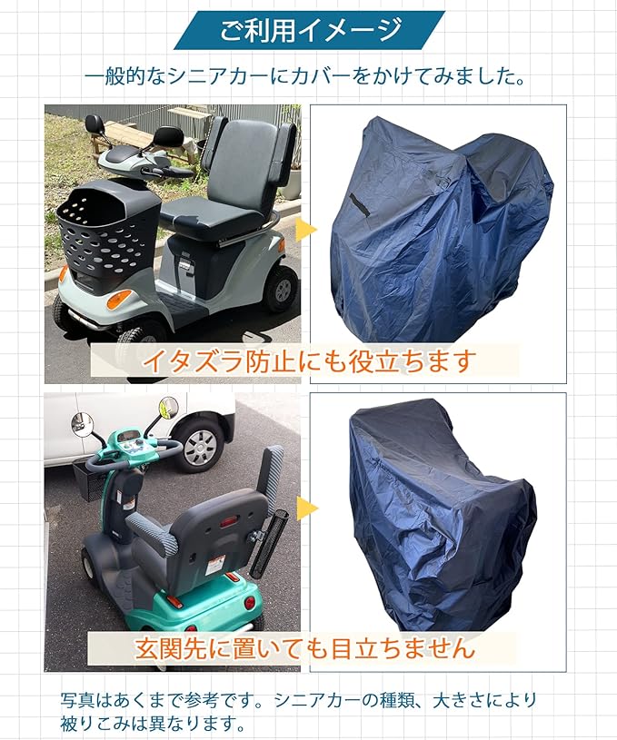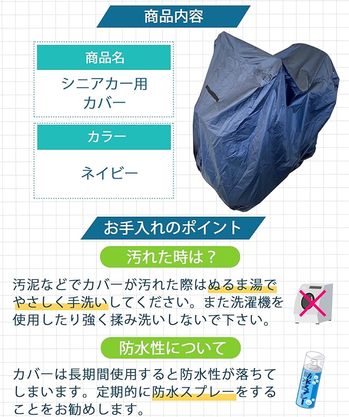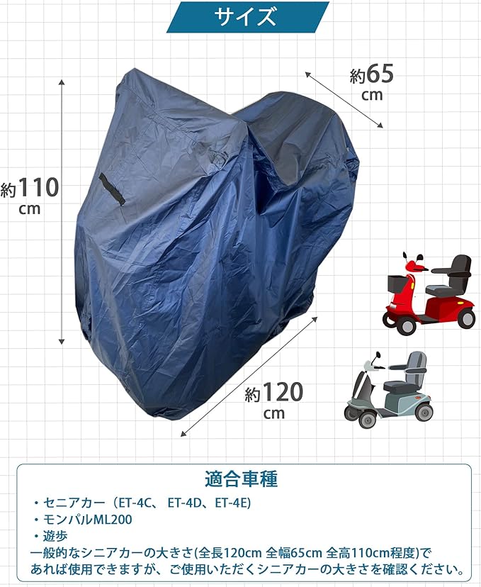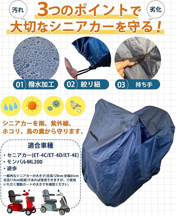【使いやすさ】シニアカー・電動カートカバーの重要ポイントである「軽量」、「耐久性」、「使いやすさ」を追求しました!長くお使いいただける商品となっておりますが、長期間使用すると防水性が落ちてしまいます。定期的に防水スプレーをすることをお勧めします。