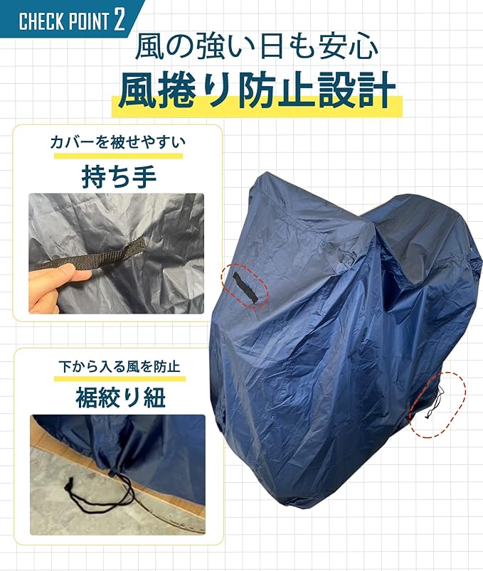 【風でとばない】裾を絞る紐が付いているので、風がカバーの下からはいり巻き上がってしまうことを防ぐ仕様となっています。