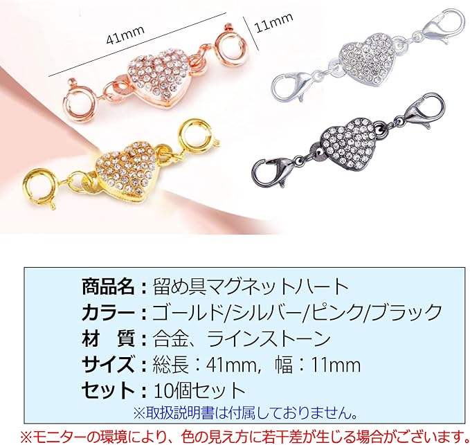 ※取扱説明書は付属しておりません。【商品内容】留め具 マグネットハート【セット内容】10個【カラー】ゴールド/シルバー/ピンク/ブラック 【サイズ】総長:41mm,幅:11mm【素材】石材 ※モニターの環境により、色の見え方に若干差が生じる場合がございます。