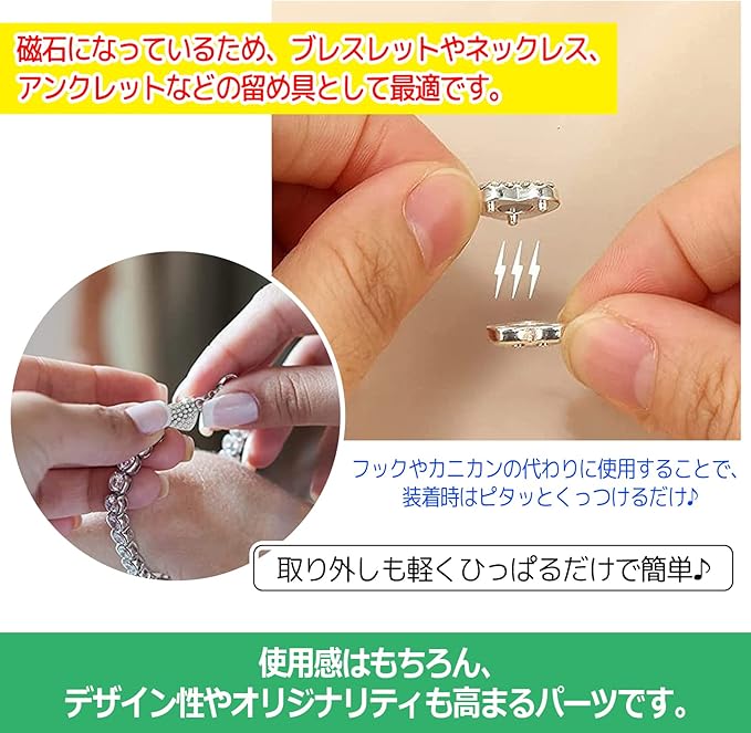 .になっているため、ブレスレットやネックレス、アンクレットなどの留め具として最適です。フックやカニカンの代わりに使用することで、装着時はピタッとくっつけるだけ♪取り外しも軽くひっぱるだけで簡単♪使用感はもちろん、デザイン性やオリジナリティも高まるパーツです。