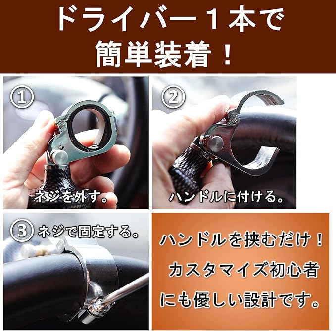 クランプ部分をハンドルに挟み込み、ネジを締めるだけの簡単装着です。取り付け方もシンプルなので女性ドライバーにもおすすめです。