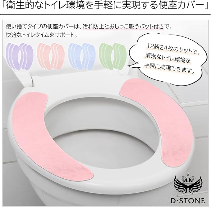 2 衛生的なトイレ環境を手軽に実現する便座カバー」、使い捨てタイプの便座カバーは、汚れ防止とおしっこ吸うパット付きで、快適なトイレタイムをサポート。12組24枚のセットで、清潔なトイレ環境を手軽に実現できます。
