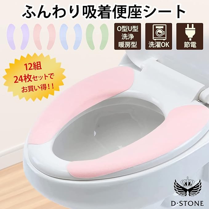 5 トイレ掃除の手間が省ける!ずれないふんわりタイプの便座シートです。「商品内容」貼るタイプの便座シート:12組24枚セット カラー:ブルー、ピンク、グリーン、パープル(全4色の各3組6枚セットずつ) サイズ:長さ37.5cm、幅10cm 備考:ハサミ等でカット可能。丸洗いもOKです。