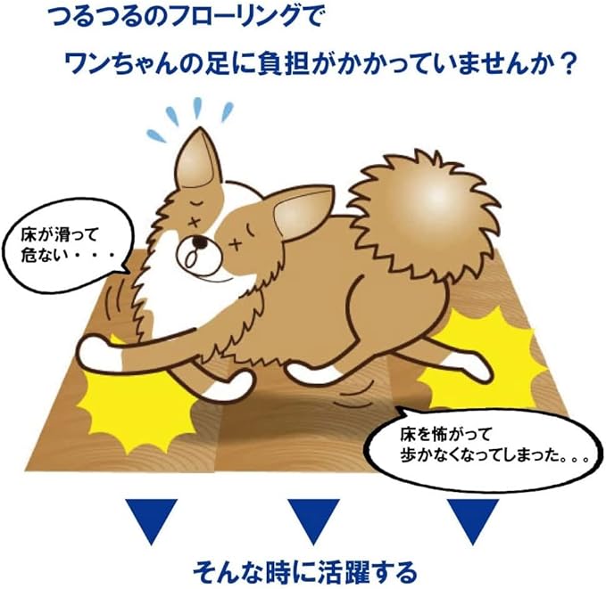 フローリングのような滑りやすい床では、犬は足が滑って上手く歩けない事があります。 滑ると足首、膝、股関節に余計な負担がかかり、最悪脱臼やヘルニアの原因にもなりかねません。 そんな時はワンちゃん用滑り止め肉球パッドをお試しください。