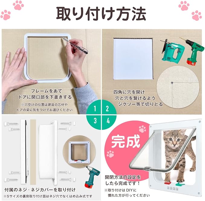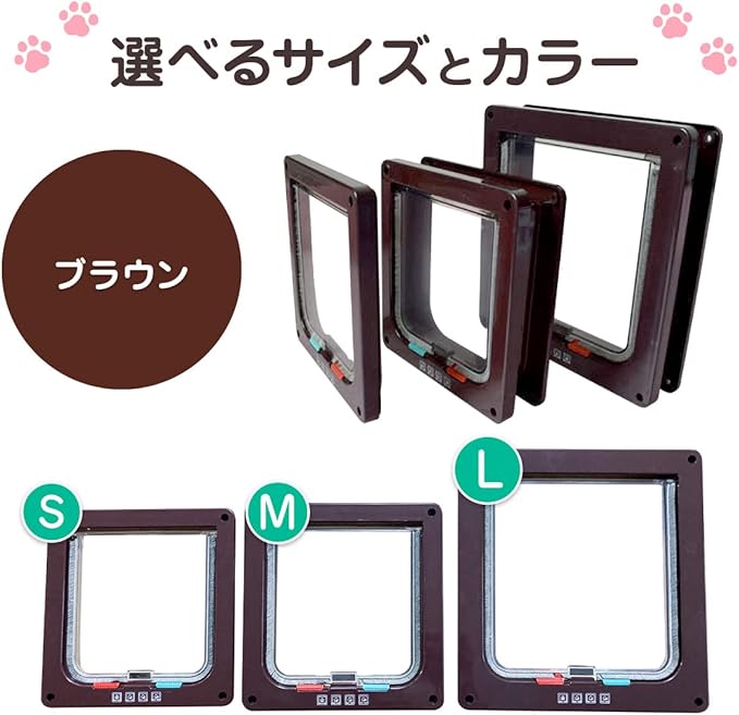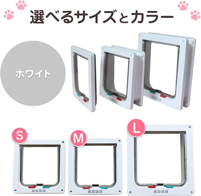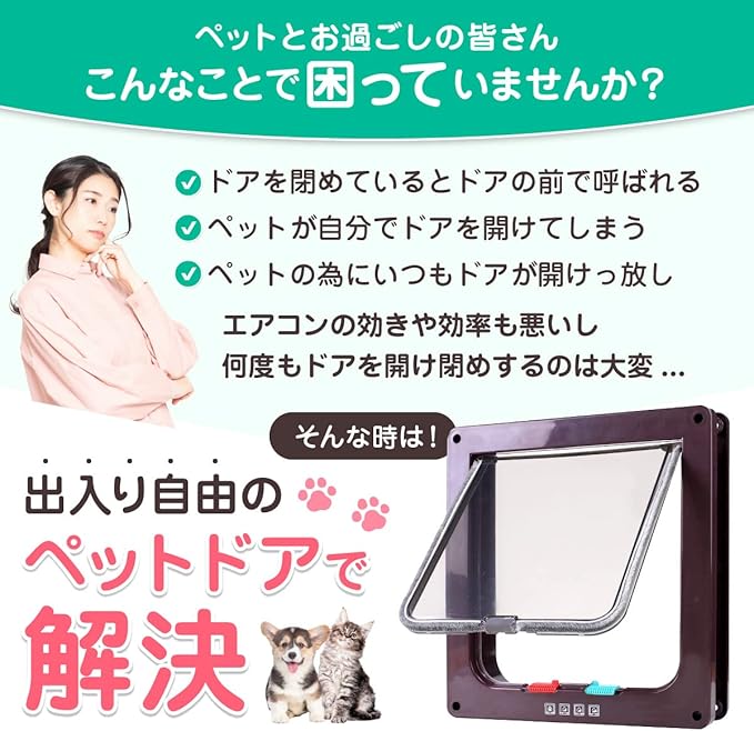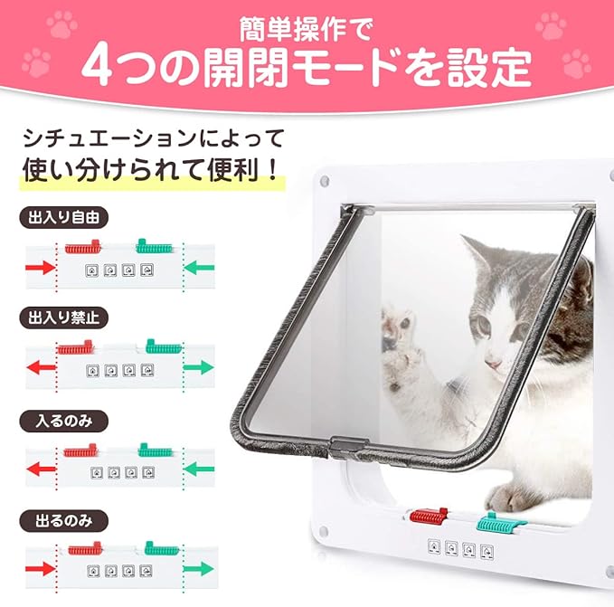 【おすすめPOINT!】■シーンに合わせて4つの開閉モードを選べる。 ■マグネット式の開閉でペットの力でも自由に出入り、通った後もピタッと閉まる。 ■開閉音を抑えるブラシ状のクッション付き。 ■ドアや壁など様々な箇所にDIYで後付け可能。 ■選べるホワイト・ブラウンの2カラー。