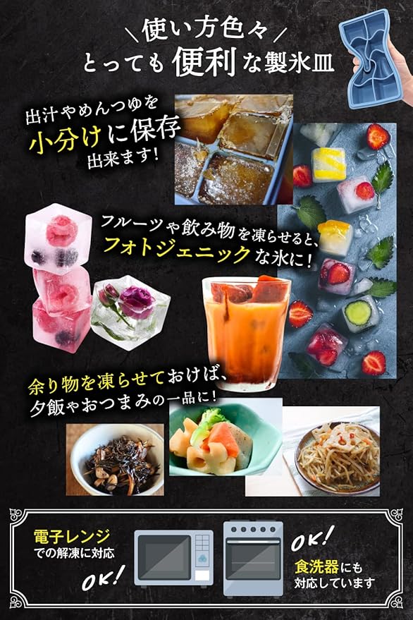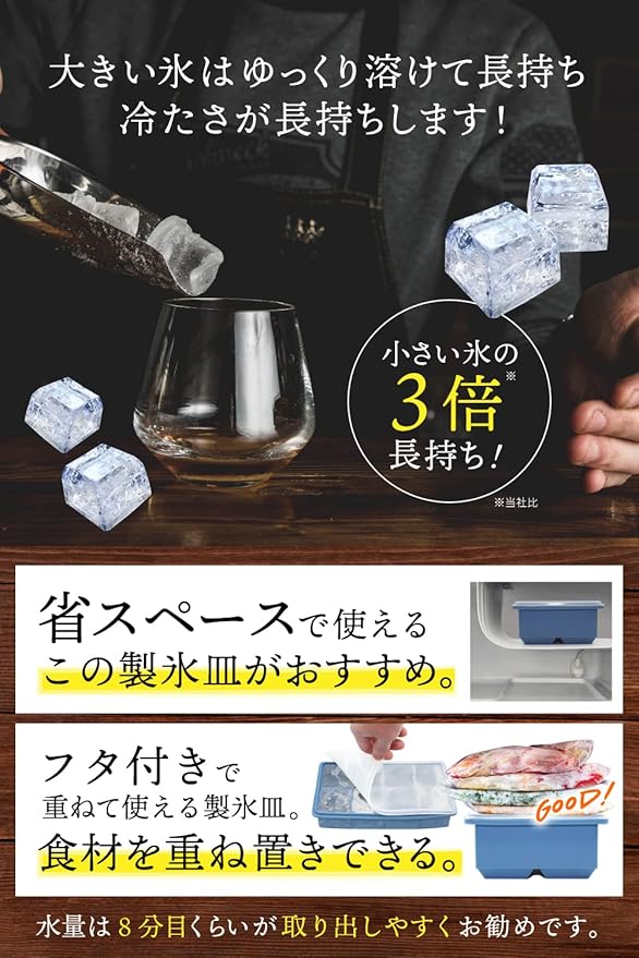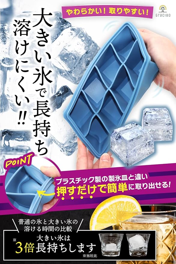 【大きな氷が作れる】約4.7cm角の氷を簡単に作れるシリコン製の製氷皿。大きい氷は家庭用冷蔵庫で出来る氷と比較して溶けにくく長時間冷たい状態を保ちます。