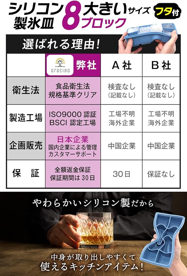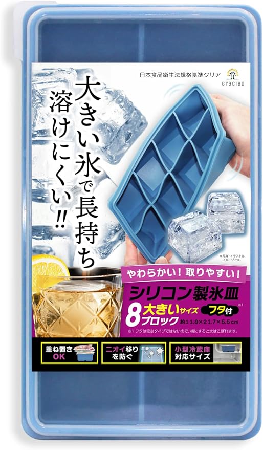 ※氷を作った際、シリコン特有の成分と水中のミネラル分が結合した結晶(白い浮遊物)が浮き出る事がございます。人体に影響はございませんが、気になる場合は軽く氷の表面をすすいでからご使用下さい。