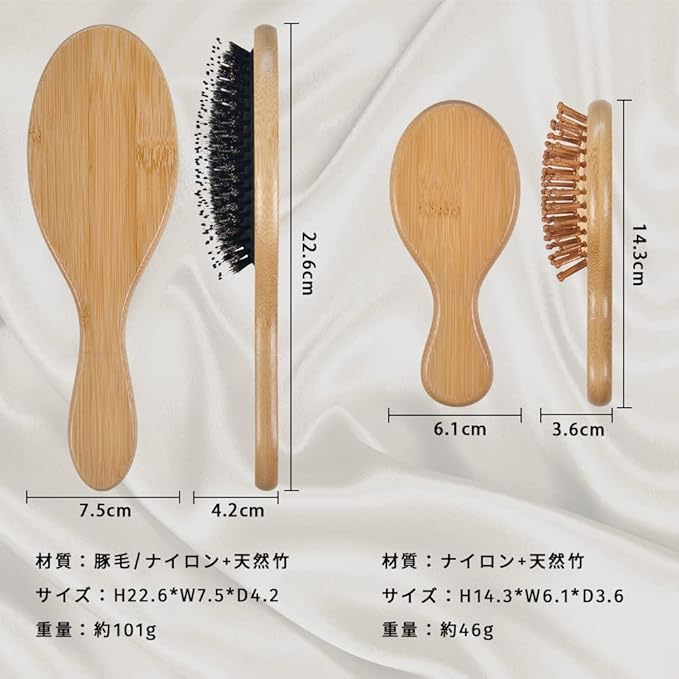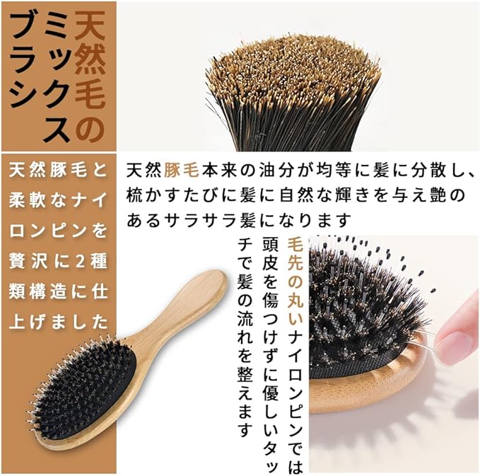 【豚毛ヘアブラシ】 丸いナイロンピンは頭皮を傷つけず髪のもつれを効果的に取り除くことができます。分泌した油分を豚毛で髪の根元から先端まで均一に分散し、艶々にしてしとやかな髪に。