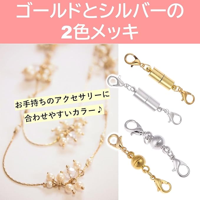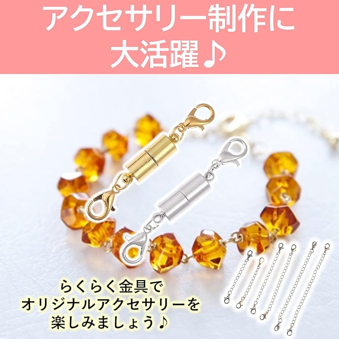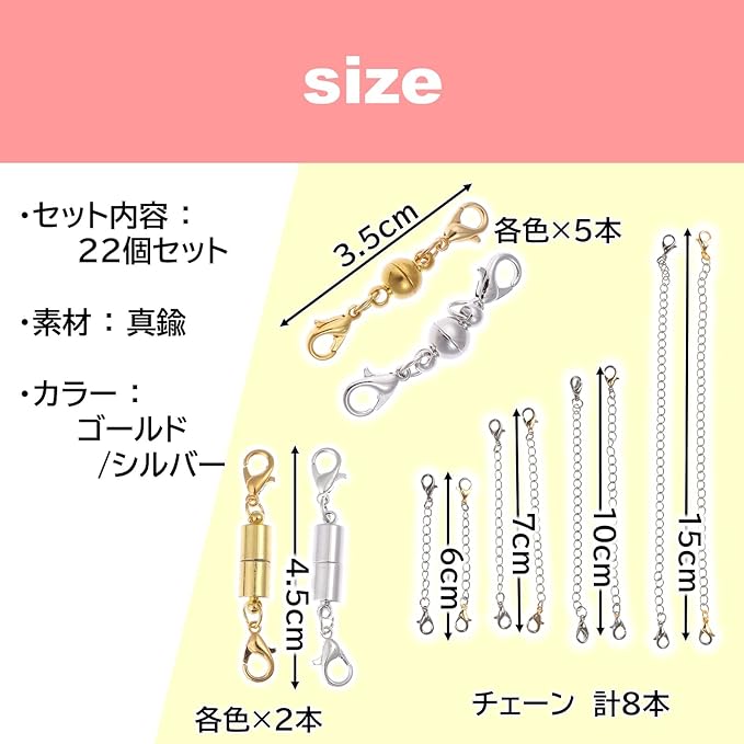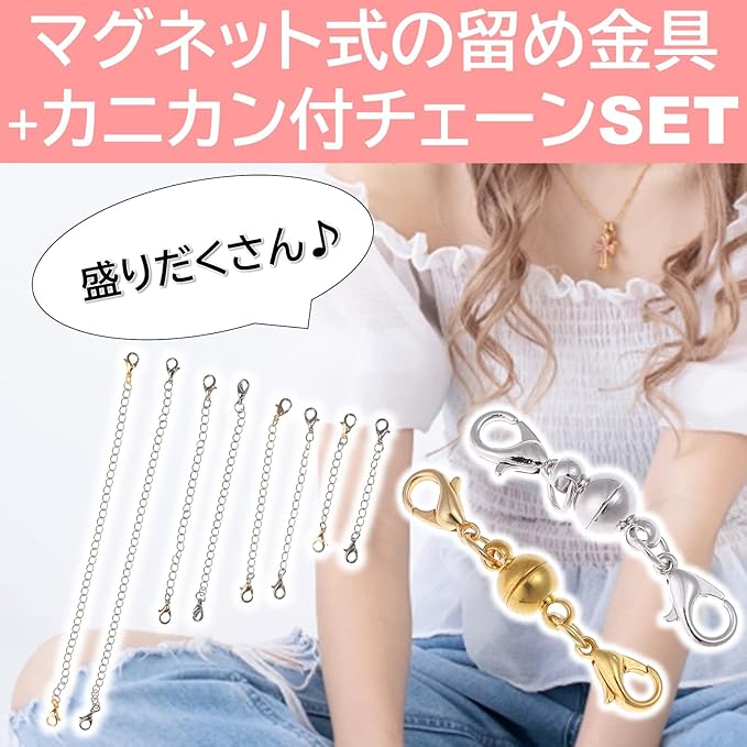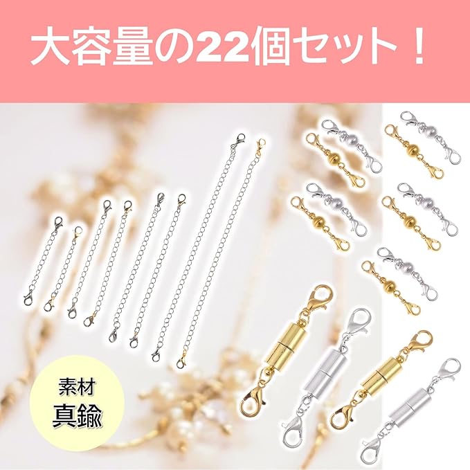 マグネット式留め金具とアジャスターとして使えるカニカン付チェーンの22点セット。アクセサリー制作やお手持ちのアクセサリーを使いやすくすることができます。