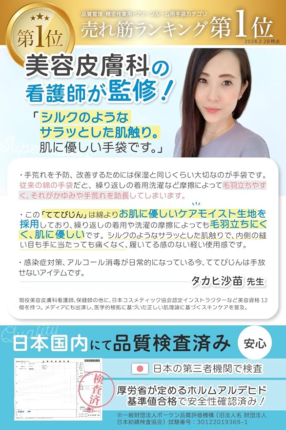 【美容皮膚科看護師監修】綿よりお肌に優しい高品質生地を採用しております。そのため繰り返しの着用や、洗濯の摩擦によっても毛羽立ちにくく、痒くなりにくく、敏感肌の方にもお使い頂けるお肌に優しい素材を使用しています。 手首部分も無縫製のため痒くなりにくく、手荒れを気にされている方に安心してご使用頂けます◎