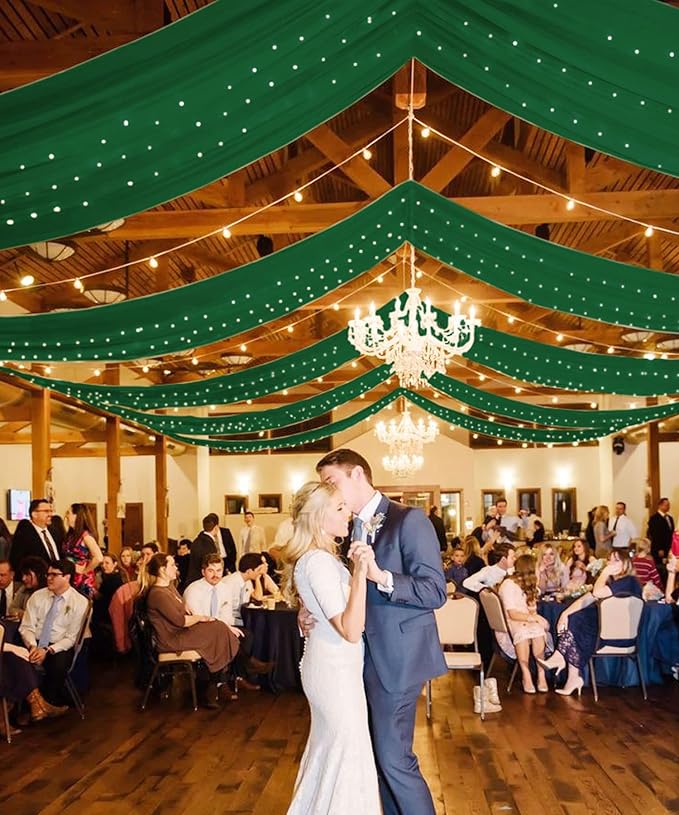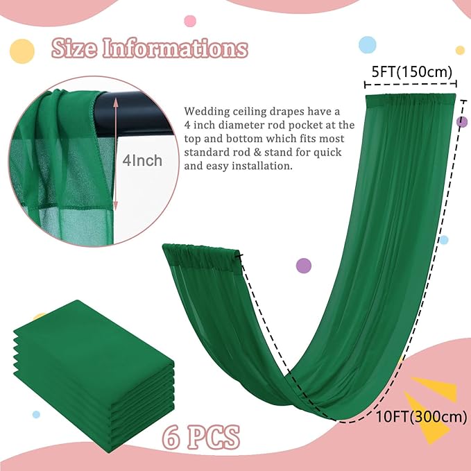 パッケージ 6パネル - エメラルドグリーンの天井ドレープ:ウェディングパーティーの天井の装飾やその他のパーティーイベントの装飾を計画していますか? 幅5フィート、長さ10フィートのダークグリーンの天井ドレープ生地をお選びください。ゲストを感動させます。 シアー生地のドレープで創造性を発揮しましょう。