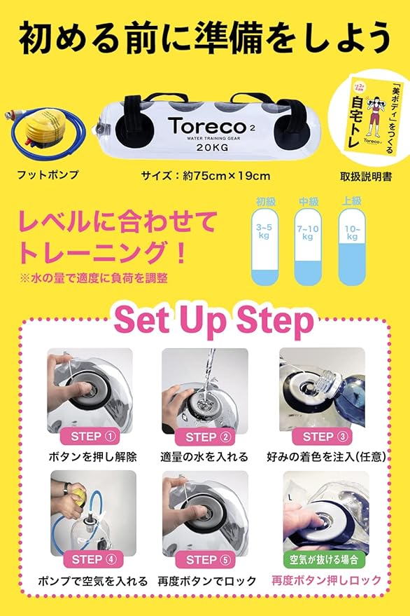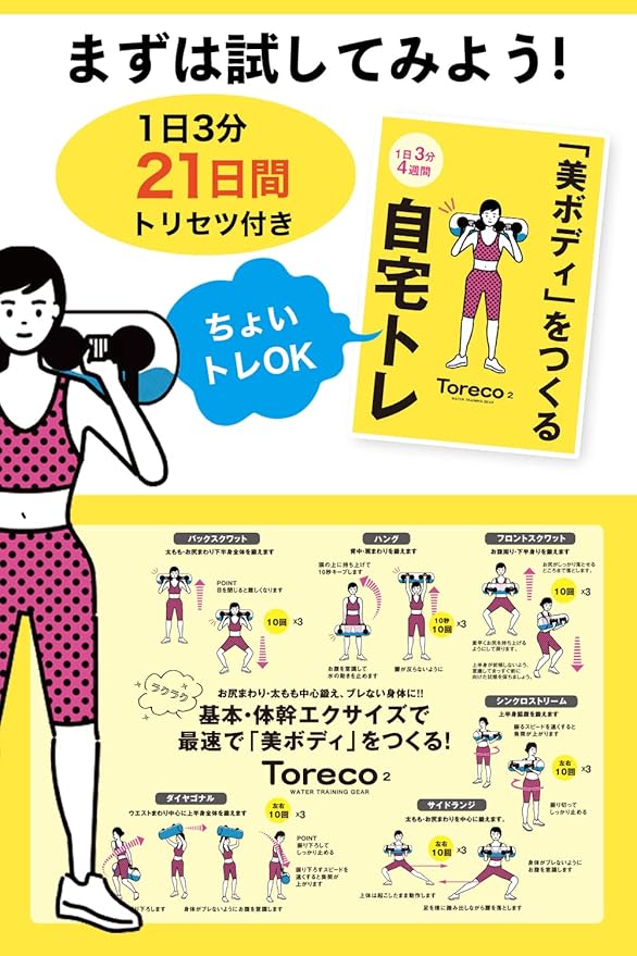 ✅【ウォーターダンベル (Toreco-2)とは】 初心者から中級者向けに水の特性を利用した体幹トレーニング器具です、ウォーターバッグとも呼ばれることもあります、ダイエット効果もあり、自宅トレーニングで全身の筋肉のバランス正しいフォームも整え余分な脂肪の少ない引き締まったカラダ「美ボディ」を手に入れるために開発した全身の筋トレグッズ。サッカーで日本を代表する名選手も、体幹トレーニングとして水を使った筋トレ器具として使っていることも有名です。Toreco-2が疲れにくいカラダ作りをサポートいたします。