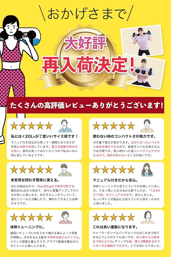 ✅【日常生活で効果を発揮する】 楽しく自宅で最速21日で「美ボティをつくるためにの取り扱い説明書(トリセツ)が付いています 全身の筋肉のバランスも整い、脂肪の少ない機能的に使えるカラダを手に入れましょう。ウォーターダンベル 、バーベルとして肩に載せてスクワット、たいかんトレーニングだけでなく各部位の集中的なエクササイズも可能。