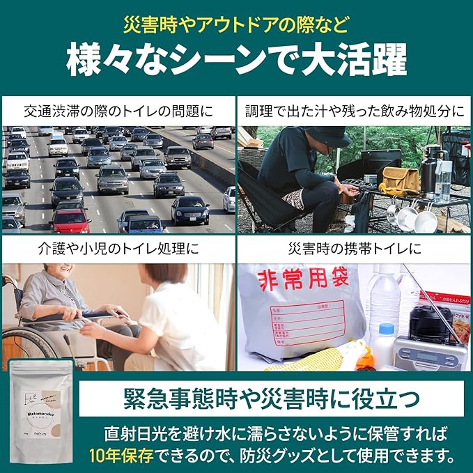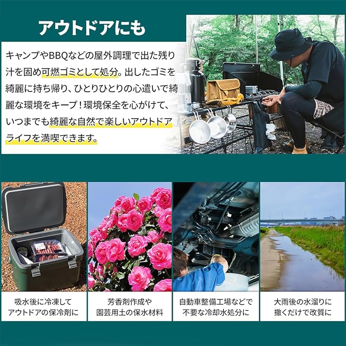 【利用シーンは多方面で】・普段のキッチン周りや食後の残り汁の処分に ・災害時や高速道路等での交通渋滞時のための携帯トイレに ・吸水後に冷凍してアウトドアの保冷剤として利用に ・大雨や水災などによる浸水被災時の泥土吐き出し ・清掃時に使用に ・大雨後の水溜まりに撒くだけで改質に ・芳香剤作成や園芸用土の保水材料として
