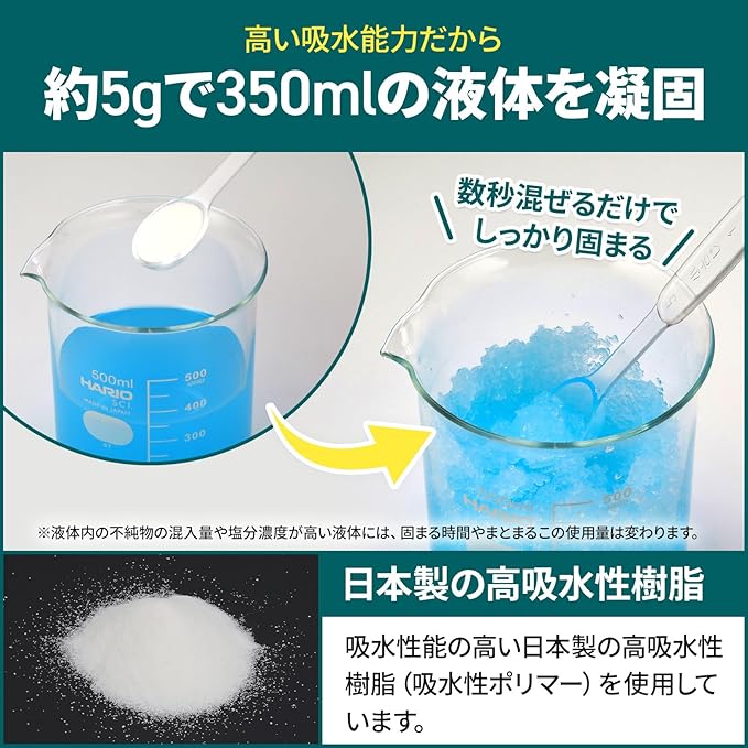 【環境にも優しい高吸水性樹脂】約5gで液体350mlを固めます。 ※液体内の不純物の混入量や塩分濃度が高い液体には固まる時間やまとまるこの使用料は変わります。