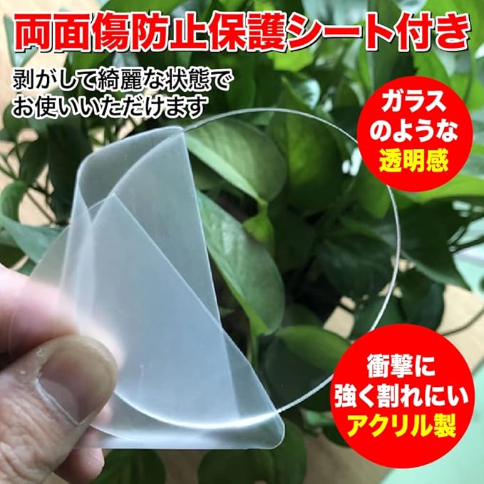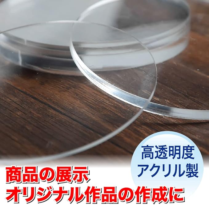 【透明なアクリル製】商品の展示や手芸にお使いいただけるアクリル製の円板になります。ガラスのような透明感がありながら、衝撃にも強く割れにくくなっており扱いやすくなっております。