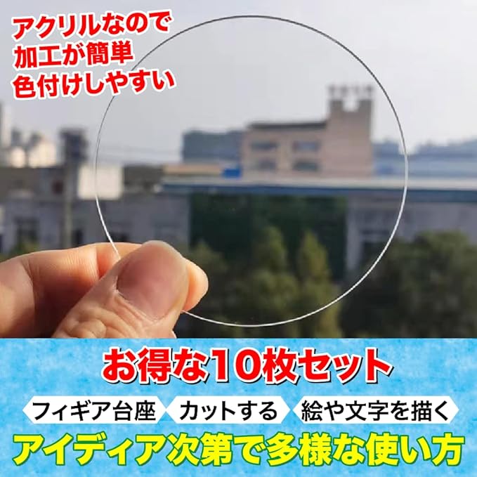 【お得な10枚セット】円形のため手触りも良く、汚れても拭いて綺麗にすることができます。10枚セットですので、フィギュアの土台や穴を開けてオリジナルキーホルダーの作成にお使い頂けます。