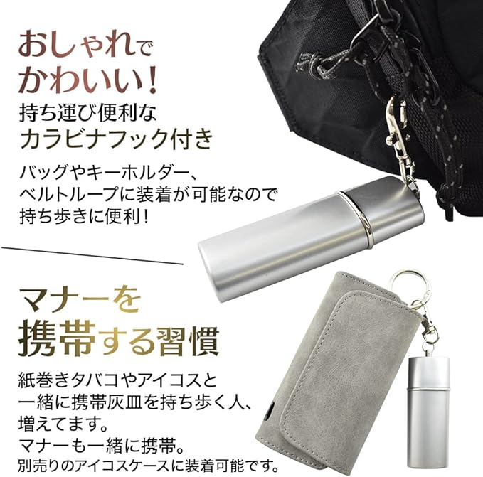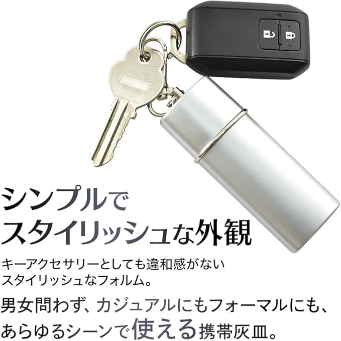 【シンプルでスタイリッシュな外観】キーアクセサリーとしても違和感がないスタイリッシュなフォルム。男女問わず、カジュアルにもフォーマルにもあらゆるシーンで使える携帯灰皿です。