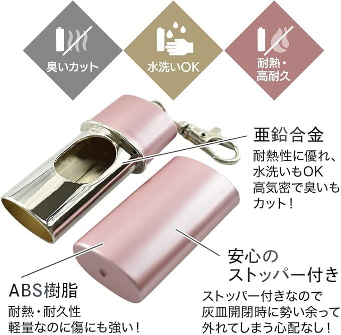 【カラビナ付きで持ち運び便利】カラビナフック付きでベルトループやバッグなどに引っ掛けて持ち運べます。手のひらサイズのコンパクト携帯灰皿なのに、入れ口が広く使いやすい!
