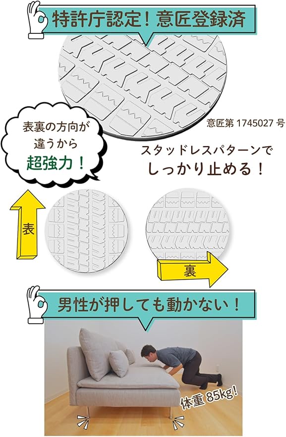✅【両面スタッドレスエンボス加工】表と裏のパターンの向きを変えることでどんな方向からの力も 強力 に受け止めます。だから、しっかり床をとらえて離さずどんなに動いてもズレません。