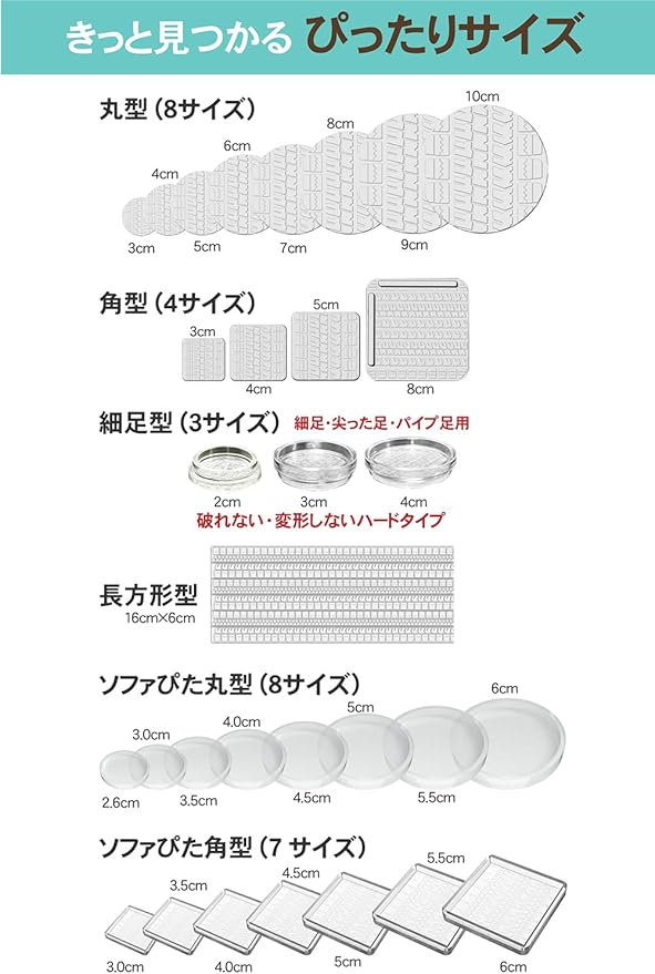 ✅【サイズが豊富】ほとんどのソファ滑り止めは1~3サイズしかラインナップがありません。Shellyのソファー滑り止めは丸型・正方形型・長方形型・細足専用型の4タイプ全16サイズを取り揃えています。あなたのソファにピッタリサイズの滑り止めがきっと見つかります。
