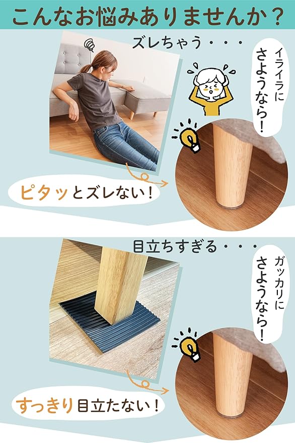 ✅【はみ出さない】ソファの足の形状に合わせたぴったりサイズなので、滑り止めが足からはみ出ません。ペットがかじったり、お掃除ロボットが引っ掛かったりせず、見た目もスッキリおしゃれです