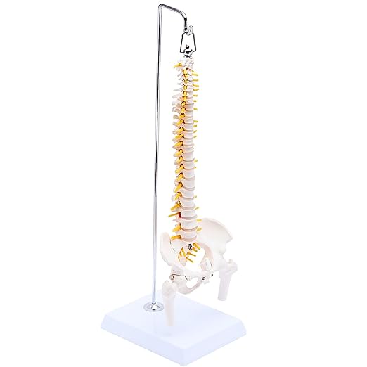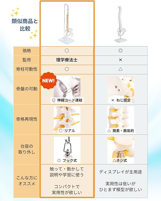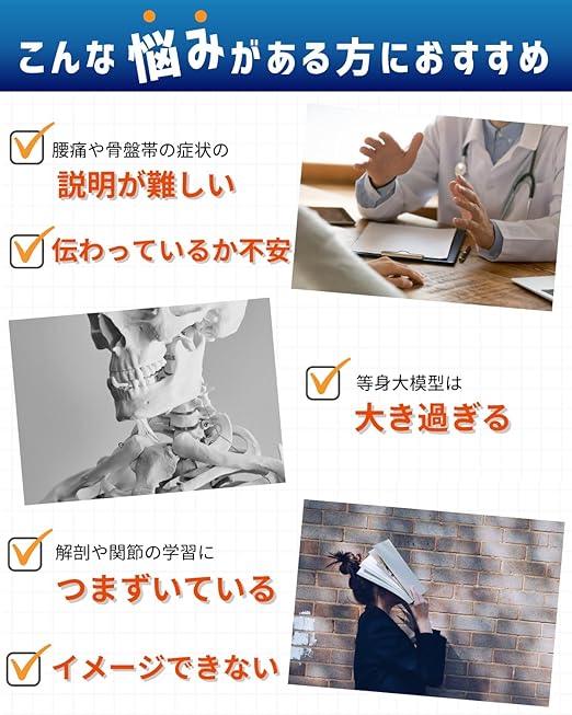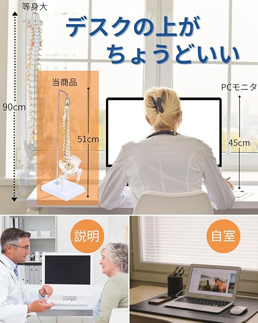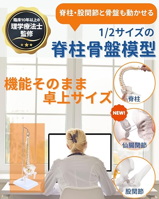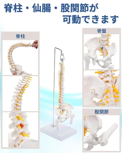 ✅【2023.11一部改良 骨盤(仙腸関節)も可動できます】約1/2のミニサイズの脊柱骨格模型。卓上サイズながら骨格を高精度に再現。脊柱はフレキシブルな金属、股関節と骨盤は伸縮コードにて連結され様々な方向に可動。触るだけでなく動かすことで骨や関節などの説明や学習効率がup