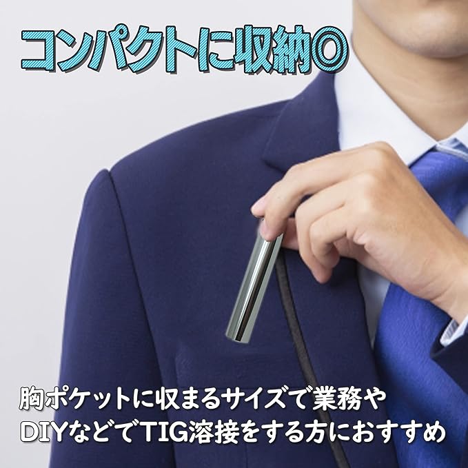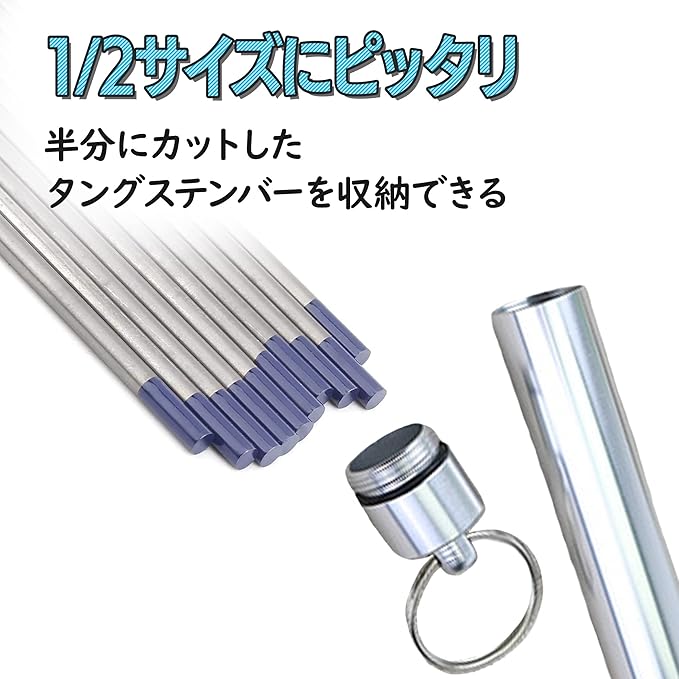 便利なタングステン収納ケース:通常の長さが約15cmのTIG溶接用タングステンバーを半分にカットし、研いだ状態のものを収納、携帯するのに便利なタングステン収納ケースです。落下防止用のチェーンも付属しています。
