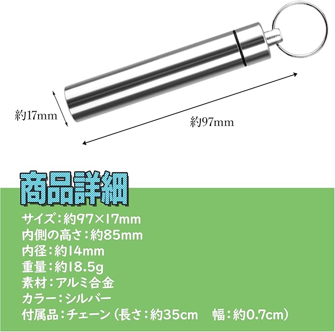 サイズ:約97 17mm 内側の高さ:約85mm 内径:約14mm 重量:約18.5g 素材:アルミ合金 カラー:シルバー 付属品:チェーン(長さ:約35cm 幅:約0.7cm) ※モニターの環境等により、色の見え方に若干差が生じる場合がございます。