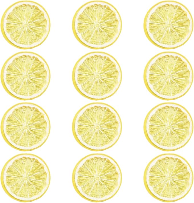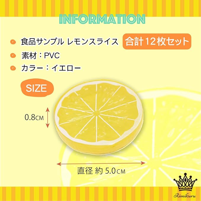 【商品仕様】セット内容:サンプル レモン スライス 合計12枚セット サイズ:直径 約5.0cm 0.8cm 素材:PVC カラー:イエロー ※モニターの環境等により、色の見え方に若干差が生じる場合がございます。