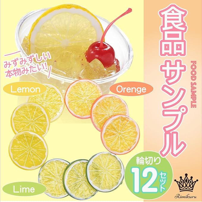 サンプル レモンスライス お得な12枚セット:みずみずしく本物感のあるリアルな輪切りレモン サンプルのセットです。レモン、ライム、オレンジの3つをご用意しましたので、お好みに合わせてお選びいただけます。