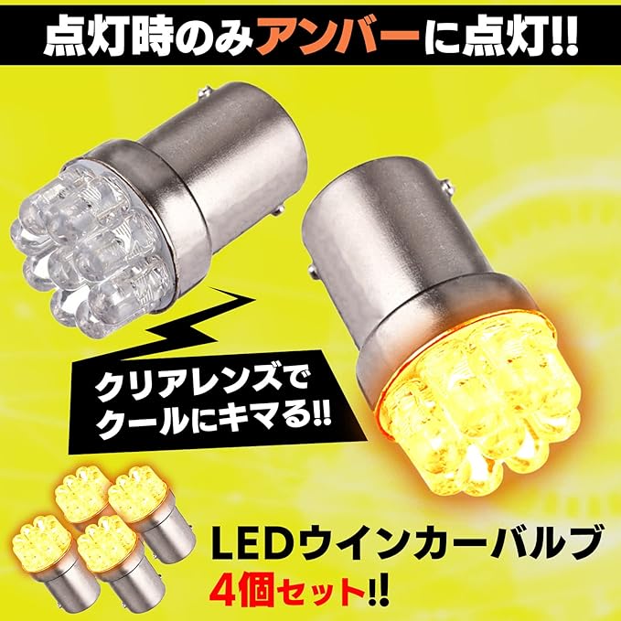 通常のバルブはオレンジ色で目立ちますがこの商品はクリアレンズを使用しているので非点灯時でも極めてステルス性が高いウインカーです。 また、12V対応で点灯時のみオレンジ(アンバー)に光り、通常のハロゲン球とほぼ同じ大きさで干渉しにくい為、まさに理想のLEDバルブといえます。 ※LEDなので省エネで広拡散レンズが採用されています。