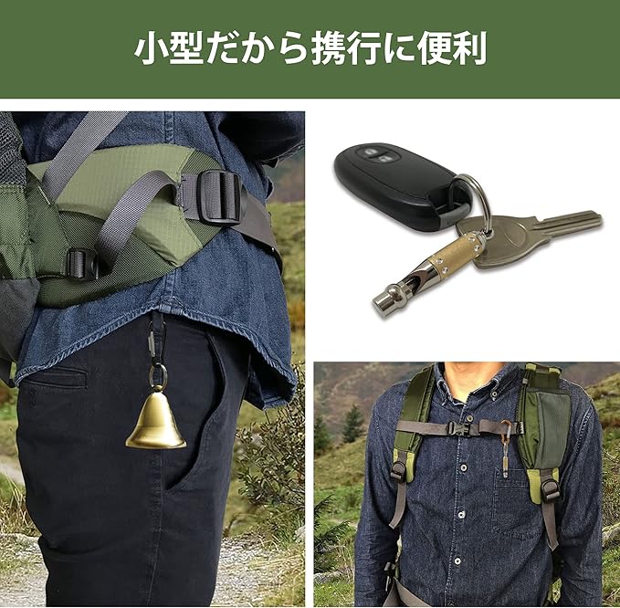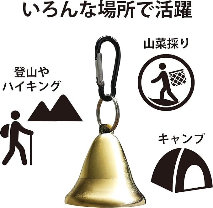 【熊避けに効果を発揮する大型ベル】登山やハイキングなど、山の中でクマとの遭遇を避けるには、熊避け鈴の音を鳴らし、こちらの存在をいち早くクマに知らせる事が重要です。約4.8cm 4.7cmと大型サイズの熊ベルは音が大きく遠くに響くので熊避けに効果を発揮します。