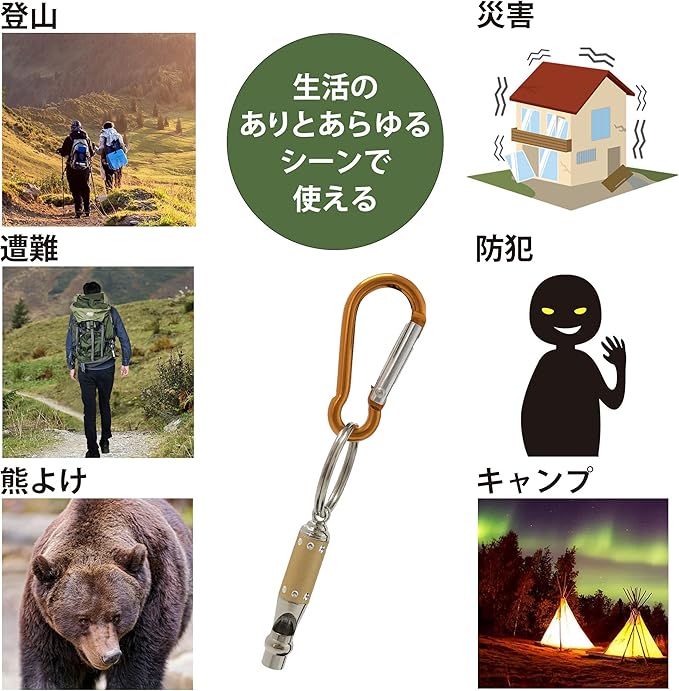 【カラビナ付き】熊よけベルや笛が不要になってもワンタッチのカラビナ付なので取り外しはとても簡単、アレンジは自由自在です。登山、ハイキング、山菜採りなどのアウトドア以外にも、防犯、災害時の防災用等、スタイルに合わせてご使用ください。