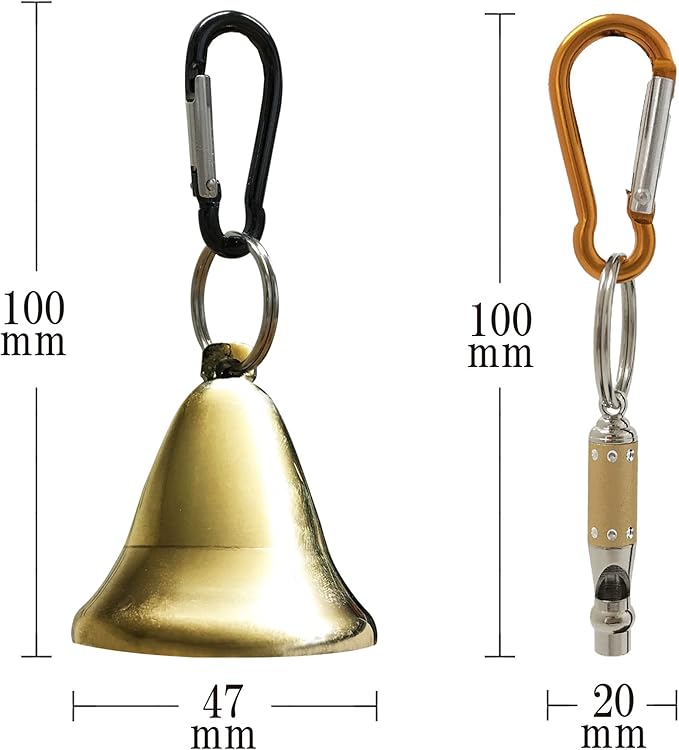 【詳細】サイズ 熊よけ鈴:約H10cm W4.7cm D4.7㎝ / 重さ:約64g ホイッスル:約W20mm D8mm H100mm/ 重さ:約10g(カラビナ含む)