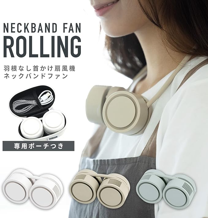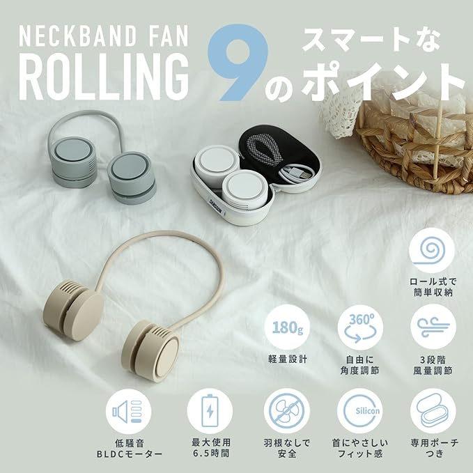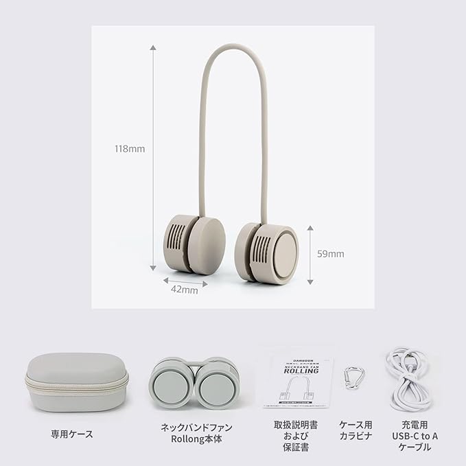 【付属品】・ネックバンドファン Rolling本体・専用ケース・ケース用カラビナ・充電用USB-C to Aケーブル・取扱説明書および.書