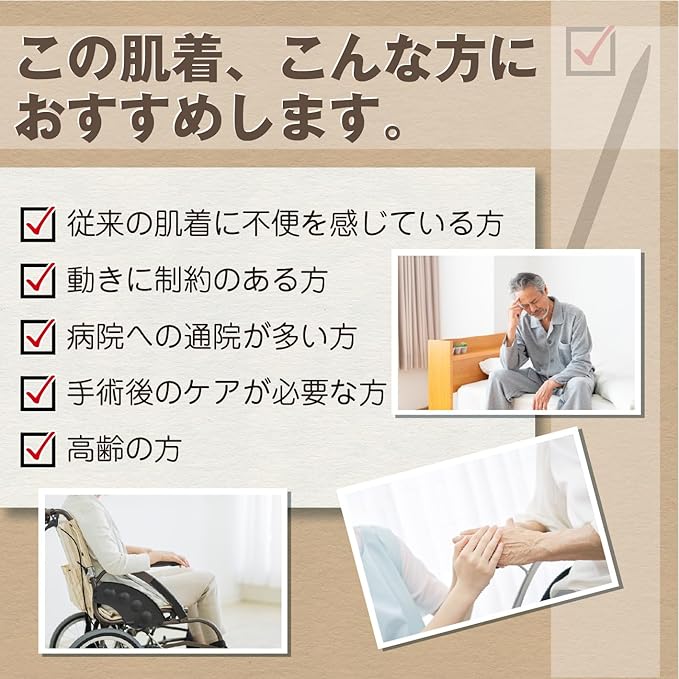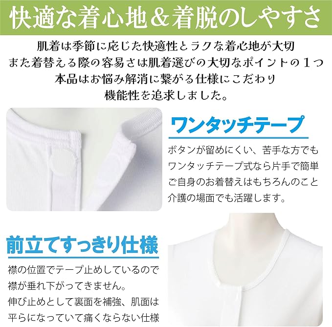 ✅ 【着脱しやすいインナー】 ボタンが苦手な方に最適な前開きインナーです。ワンタッチテープ式で、片手でも簡単に脱着できます。日常生活やリハビリ、入院時にも便利です。綿100%素材で、通気性と保温性に優れており、快適に着用できます。