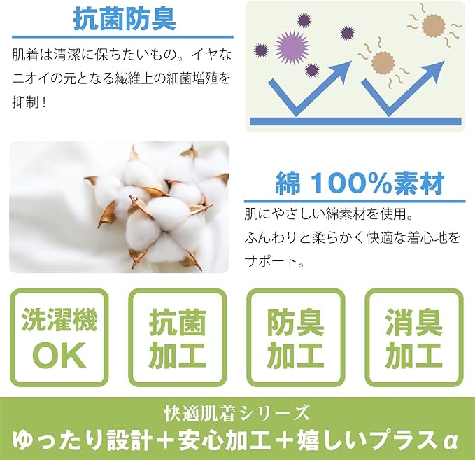 ✅ 【豊富なサイズ展開】 S〜5Lまでのサイズを揃え、抗菌・消臭加工も施しています。日常生活や長期入院、リハビリ中など、さまざまなシーンで快適に着用できます。シンプルなデザインで、男性に適したインナーです。