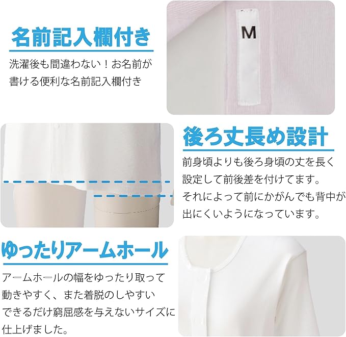 ✅ 【襟が垂れにくい】 襟部分に裏打ち処理を施し、ワンタッチテープを上部ギリギリまで縫い付けています。そのため襟が垂れにくく、長時間着用してもきれいな形を保ちます。入院や日常生活でも安心です。