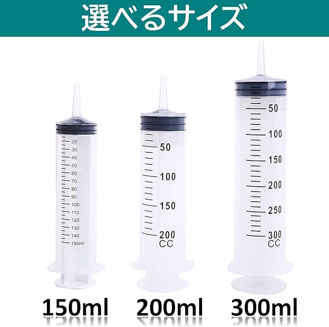 接続チューブ(約30cm長)2本付きのシリンジセット。150ml/200ml/300mlの3サイズをご用意しました。