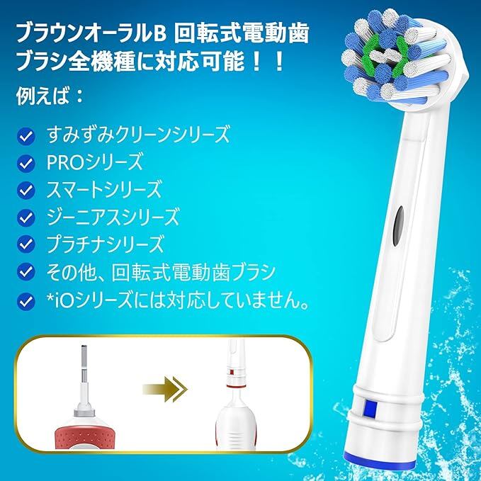 【対応機種&簡単装着】ブラウンオーラルB(braun oral b)の回転式電動歯ブラシ全機種(iOシリーズを除く)に装着できます。(例えば:すみずみクリーンキッズ/EX/ホワイト/プラス/やわらか、ジーニアス9000/8000、プラチナ・ブラック/ホワイト7000、 PRO4000/3000/2000/500/450、イージートライ3000、デンタプライド4000、スマート7000/5000/4000等)装着が簡単なスナップオンデザインで、奥まで差し込んでお使いください